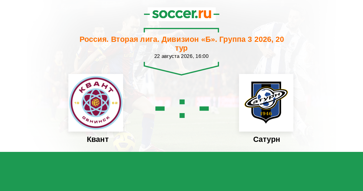Россия. Вторая лига. Группа 3 17.08.2018 Квант Логотип футбольный клуб Квант (Обнинск) 2:1 Логотип футбольный клуб Сатурн (Раменское) Сатурн