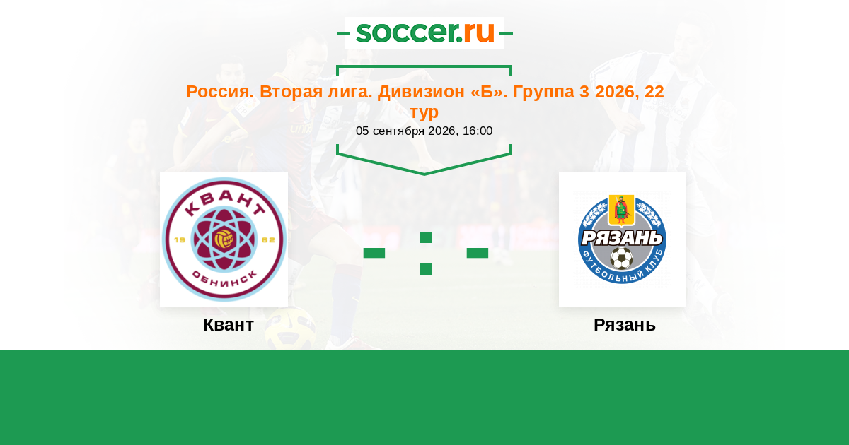 Россия. Вторая лига. Группа 3 04.09.2022 Квант Логотип футбольный клуб Квант (Обнинск) 1:0 Логотип футбольный клуб Рязань Рязань