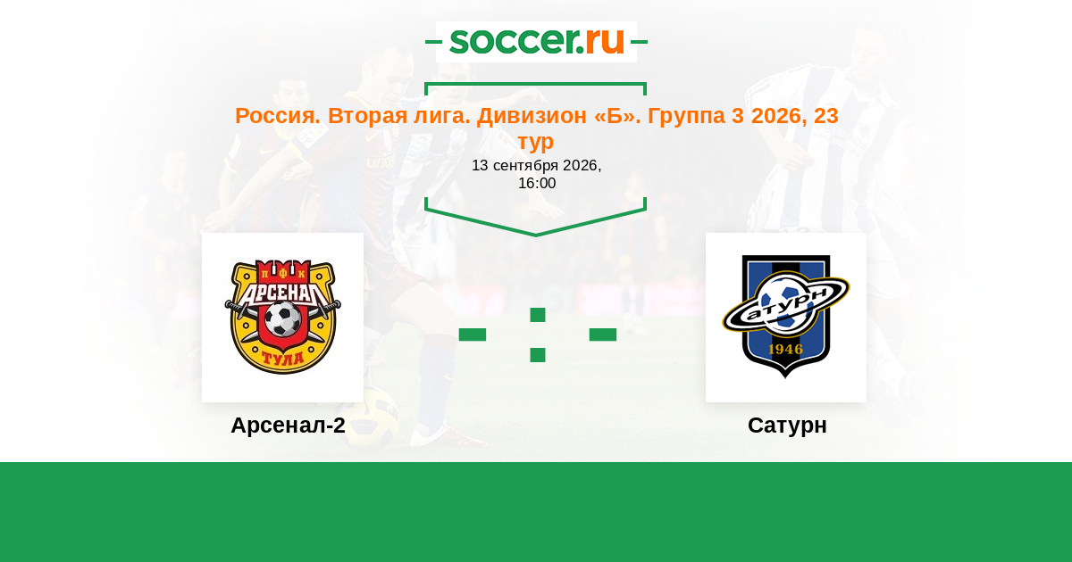 Россия. Вторая лига. Дивизион «Б». Группа 3 15.10.2023 Арсенал-2 Логотип футбольный клуб Арсенал-2 (Тула) 3:2 Логотип футбольный клуб Сатурн (Раменское) Сатурн