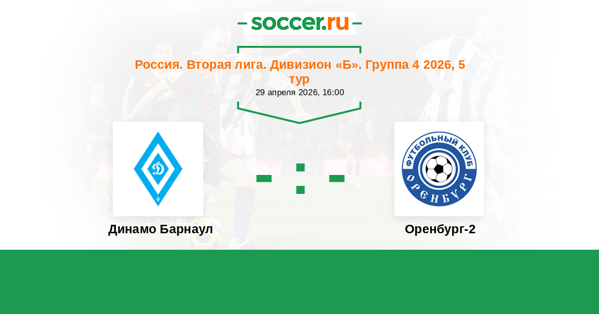 Россия. Вторая лига. Группа 4 29.04.2023 Динамо Барнаул Логотип футбольный клуб Динамо Барнаул 4:0 Логотип футбольный клуб Оренбург-2 Оренбург-2