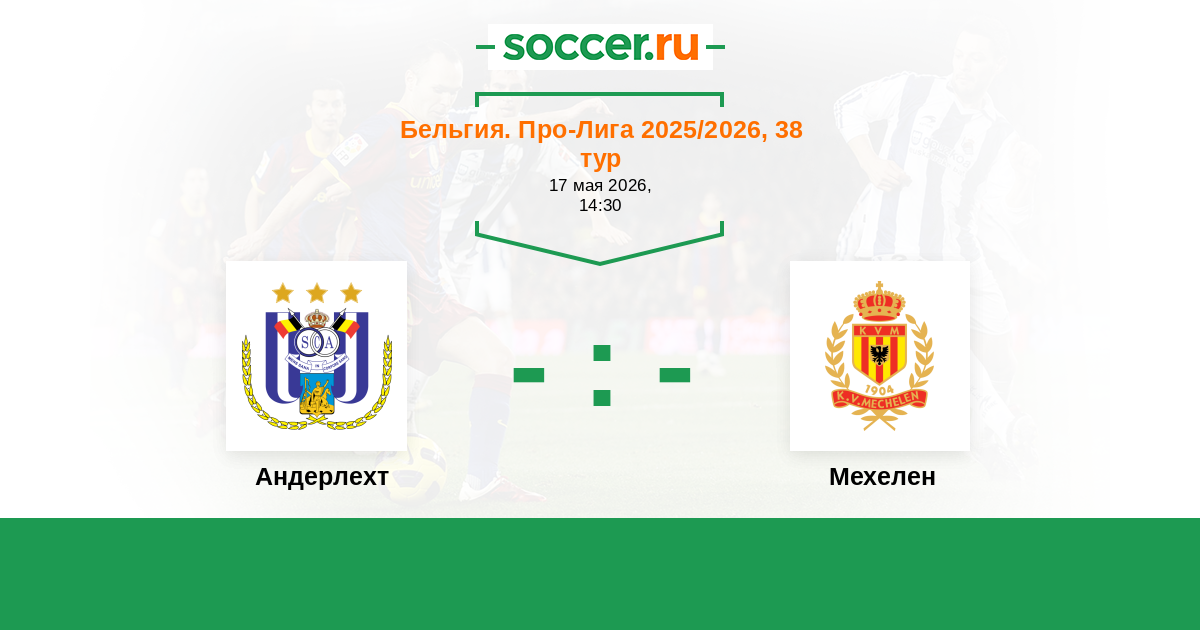 Бельгия. Про-Лига 15.03.2026 Мехелен Логотип футбольный клуб Мехелен 1:0 Логотип футбольный клуб Андерлехт (Брюссель) Андерлехт
