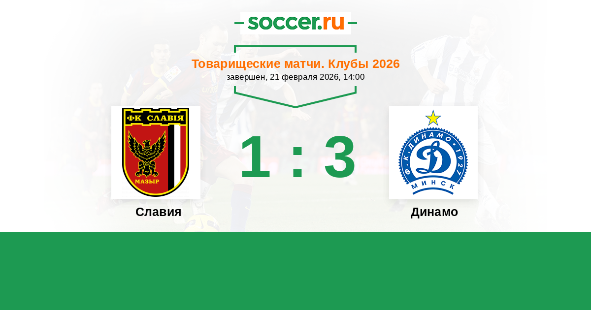 Беларусь. Высшая лига 21.03.2026 Славия Логотип футбольный клуб Славия (Мозырь) 1:2 Логотип футбольный клуб Динамо (Минск) Динамо