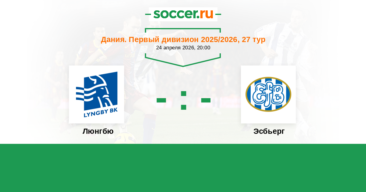 Дания. Первый дивизион 18.03.2022 Эсбьерг Логотип футбольный клуб Эсбьерг 0:3 Логотип футбольный клуб Люнгбю (Конгес Люнгбю) Люнгбю