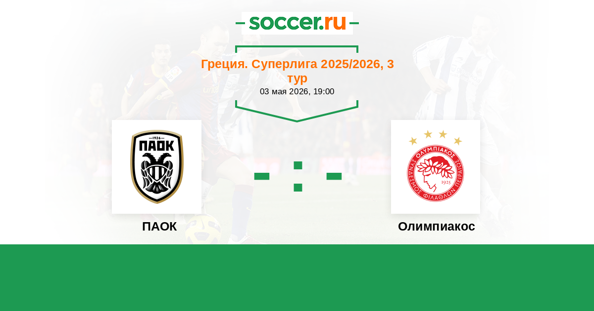 Греция. Суперлига 04.05.2025 Олимпиакос Логотип футбольный клуб Олимпиакос (Пирей) 4:2 Логотип футбольный клуб ПАОК (Салоники) ПАОК