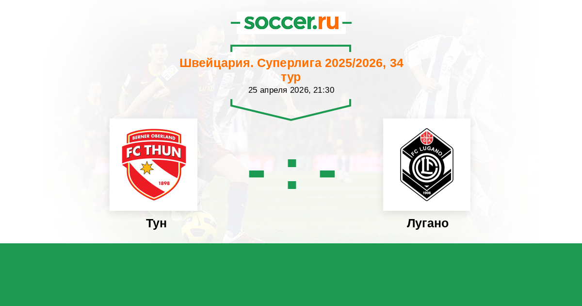Швейцария. Суперлига 04.04.2026 Лугано Логотип футбольный клуб Лугано 1:0 Логотип футбольный клуб Тун Тун