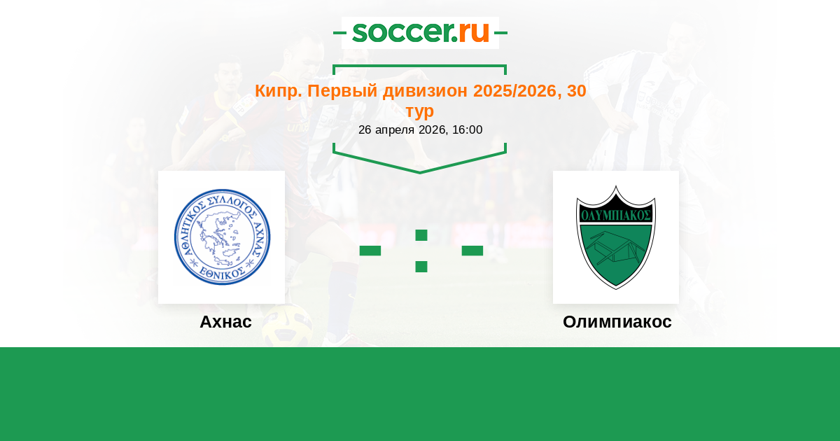 Кипр. Первый Дивизион 02.04.2022 Ахнас Логотип футбольный клуб Ахнас 1:0 Логотип футбольный клуб Олимпиакос (Никосия) Олимпиакос