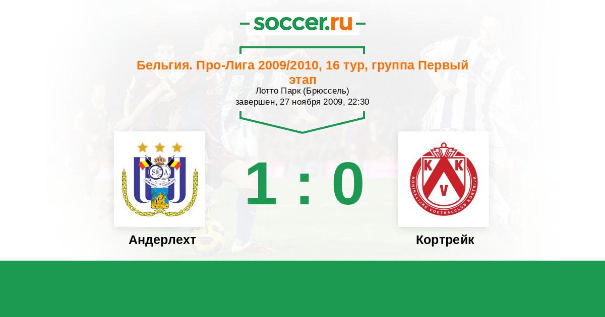 Бельгия. Про-Лига 14.04.2010 Андерлехт Логотип футбольный клуб Андерлехт (Брюссель) 1:0 Логотип футбольный клуб Кортрейк Кортрейк
