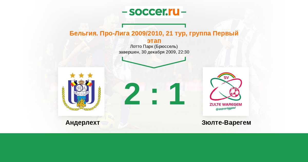 Бельгия. Про-Лига 30.04.2010 Зюлте-Варегем Логотип футбольный клуб Зюлте-Варегем 0:0 Логотип футбольный клуб Андерлехт (Брюссель) Андерлехт