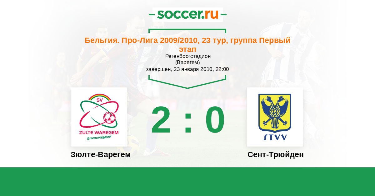Бельгия. Про-Лига 31.03.2010 Зюлте-Варегем Логотип футбольный клуб Зюлте-Варегем 1:2 Логотип футбольный клуб Сент-Трюйден (Синт-Трёйден) Сент-Трюйден