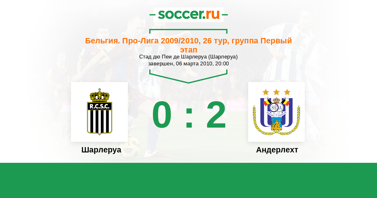 Бельгия. Про-Лига 17.10.2009 Андерлехт Логотип футбольный клуб Андерлехт (Брюссель) 2:0 Логотип футбольный клуб Шарлеруа Шарлеруа