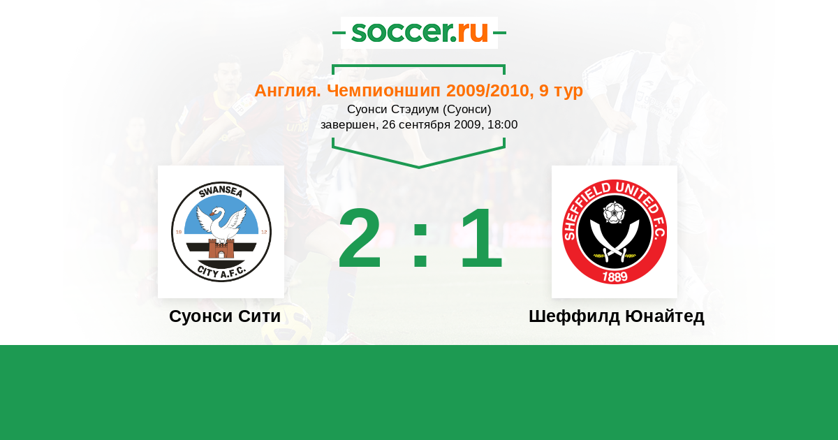 Англия. Чемпионшип 24.04.2010 Шеффилд Юнайтед Логотип футбольный клуб Шеффилд Юнайтед 2:0 Логотип футбольный клуб Суонси Сити Суонси Сити