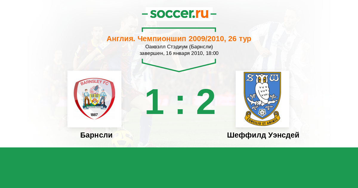 Англия. Чемпионшип 15.12.2012 Барнсли Логотип футбольный клуб Барнсли 0:1 Логотип футбольный клуб Шеффилд Уэнсдей Шеффилд Уэнсдей