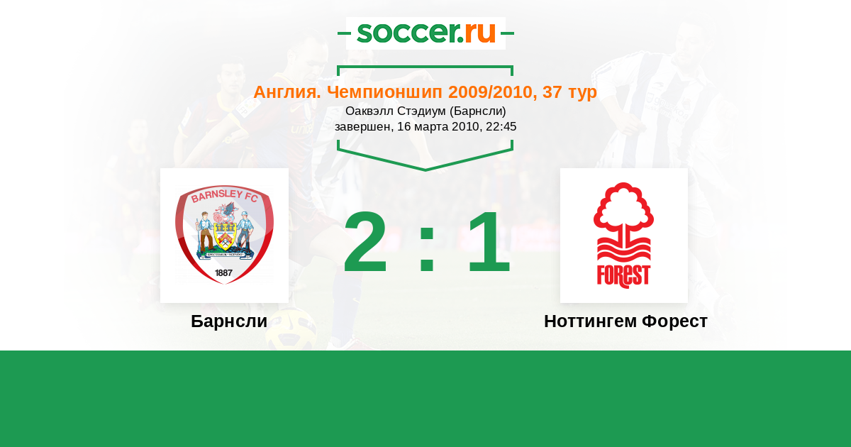 Англия. Чемпионшип 16.10.2010 Барнсли Логотип футбольный клуб Барнсли 3:1 Логотип футбольный клуб Ноттингем Форест Ноттингем Форест