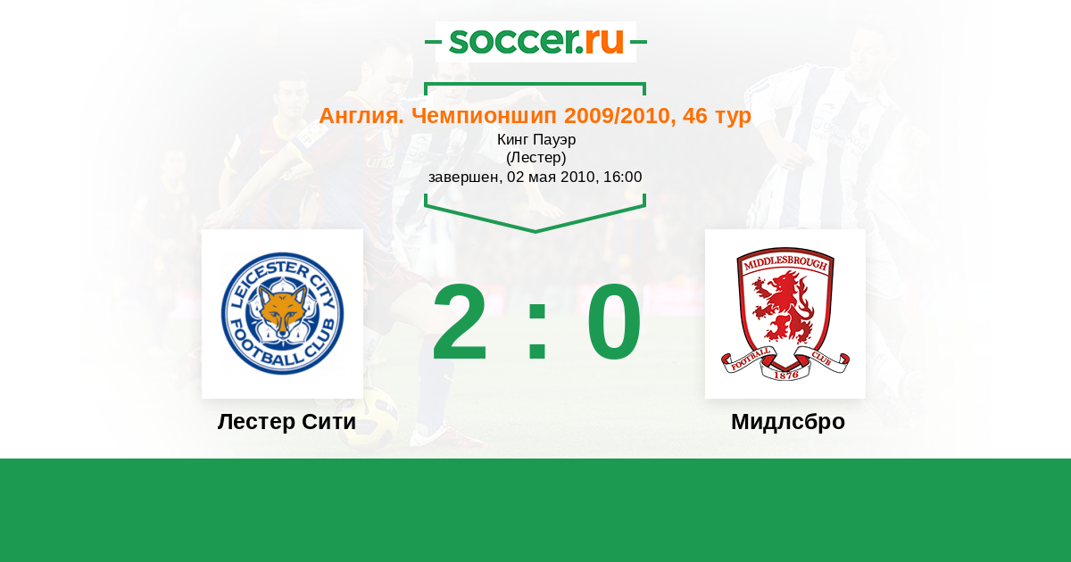 Англия. Чемпионшип 14.08.2010 Лестер Сити Логотип футбольный клуб Лестер Сити 0:0 Логотип футбольный клуб Мидлсбро Мидлсбро