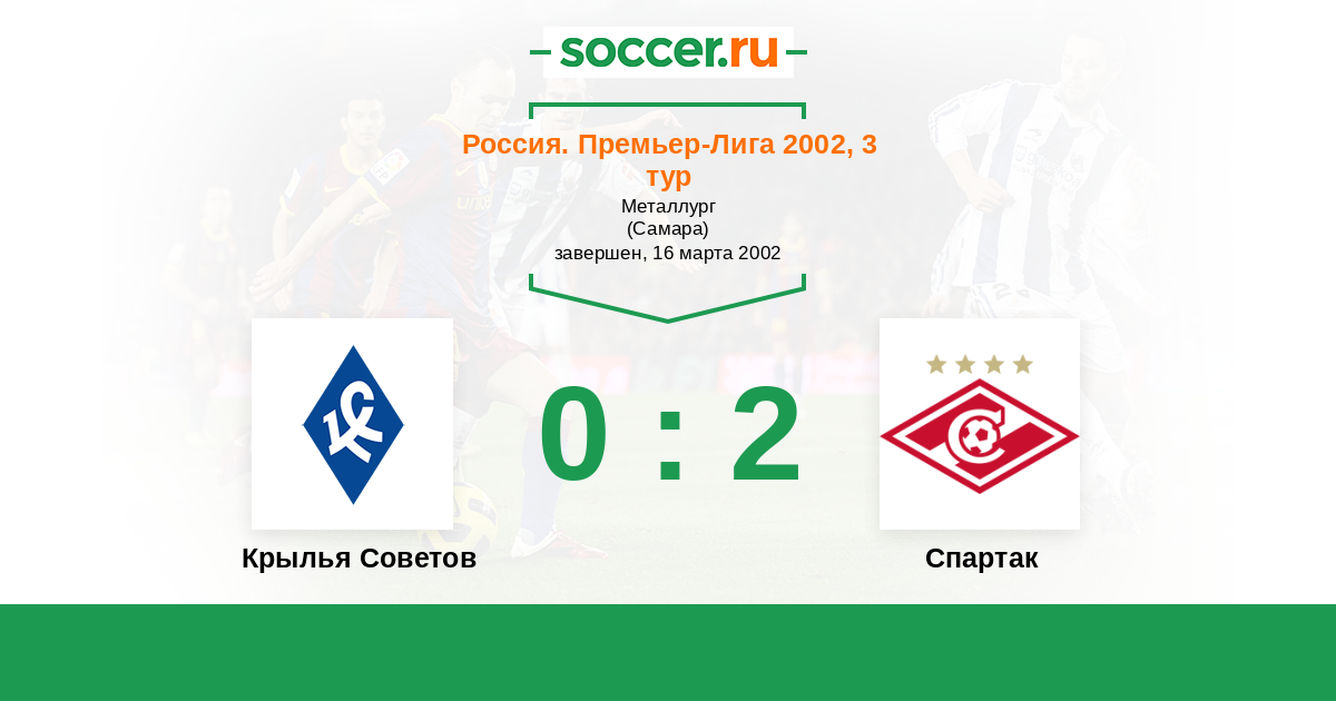 Россия. Премьер-Лига 06.10.2002 Спартак Логотип футбольный клуб Спартак (Москва) 3:1 Логотип футбольный клуб Крылья Советов (Самара) Крылья Советов