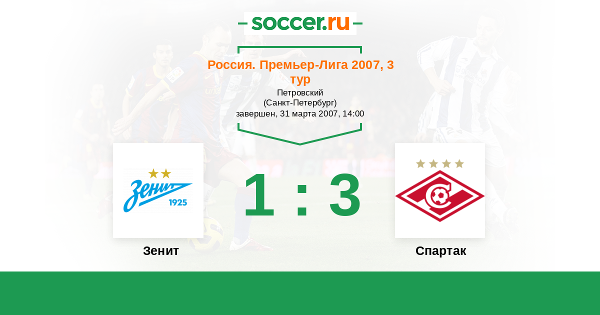 Россия. Премьер-Лига 21.07.2007 Спартак Логотип футбольный клуб Спартак (Москва) 3:1 Логотип футбольный клуб Зенит (Санкт-Петербург) Зенит
