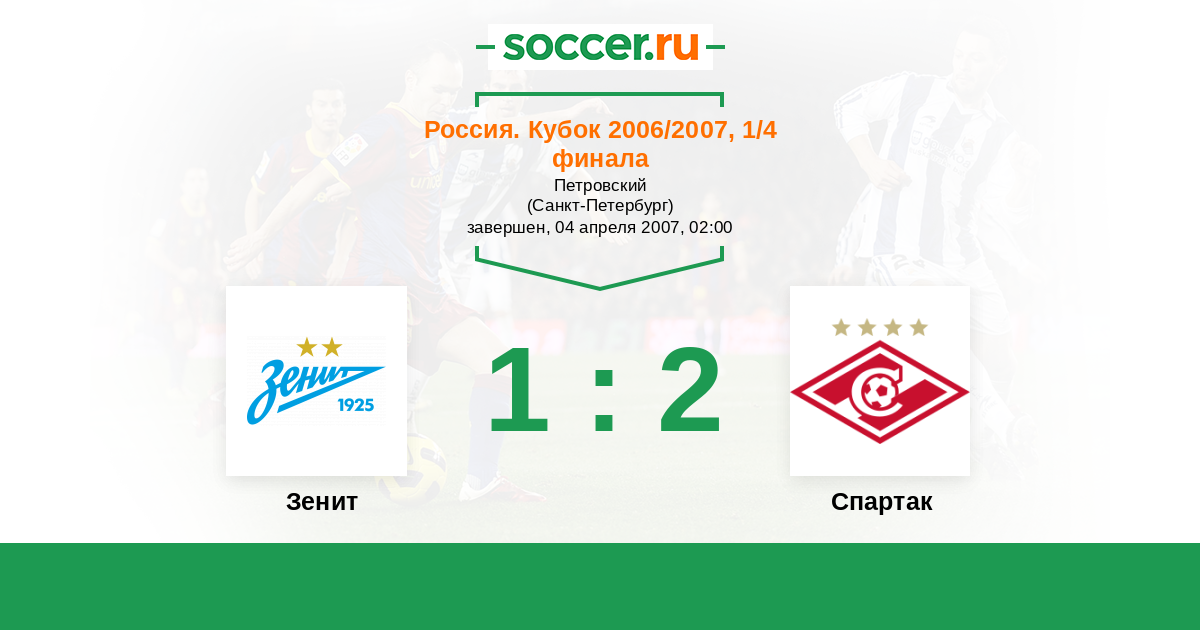 Россия. Кубок 18.04.2007 Спартак Логотип футбольный клуб Спартак (Москва) 1:1 Логотип футбольный клуб Зенит (Санкт-Петербург) Зенит