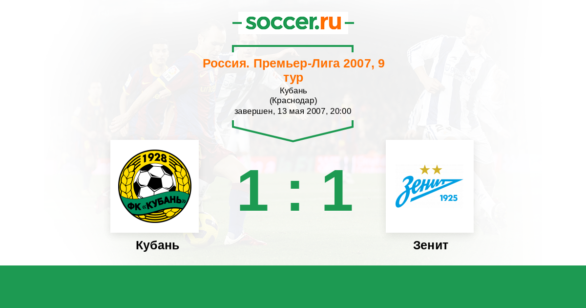 Россия. Премьер-Лига 02.09.2007 Зенит Логотип футбольный клуб Зенит (Санкт-Петербург) 1:0 Логотип футбольный клуб Кубань (Краснодар) Кубань