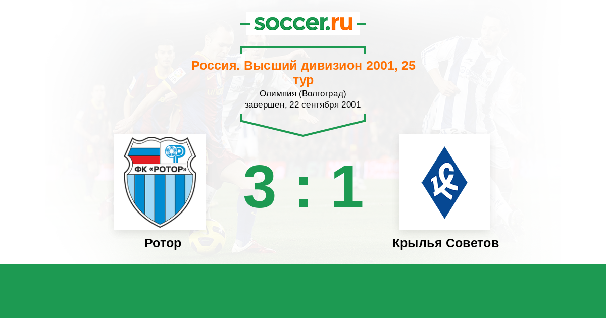 Россия. Премьер-Лига 26.05.2001 Крылья Советов Логотип футбольный клуб Крылья Советов (Самара) 3:0 Логотип футбольный клуб Ротор (Волгоград) Ротор