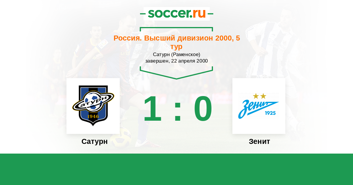 Россия. Премьер-Лига 29.07.2000 Зенит Логотип футбольный клуб Зенит (Санкт-Петербург) 1:1 Логотип футбольный клуб Сатурн (Раменское) Сатурн