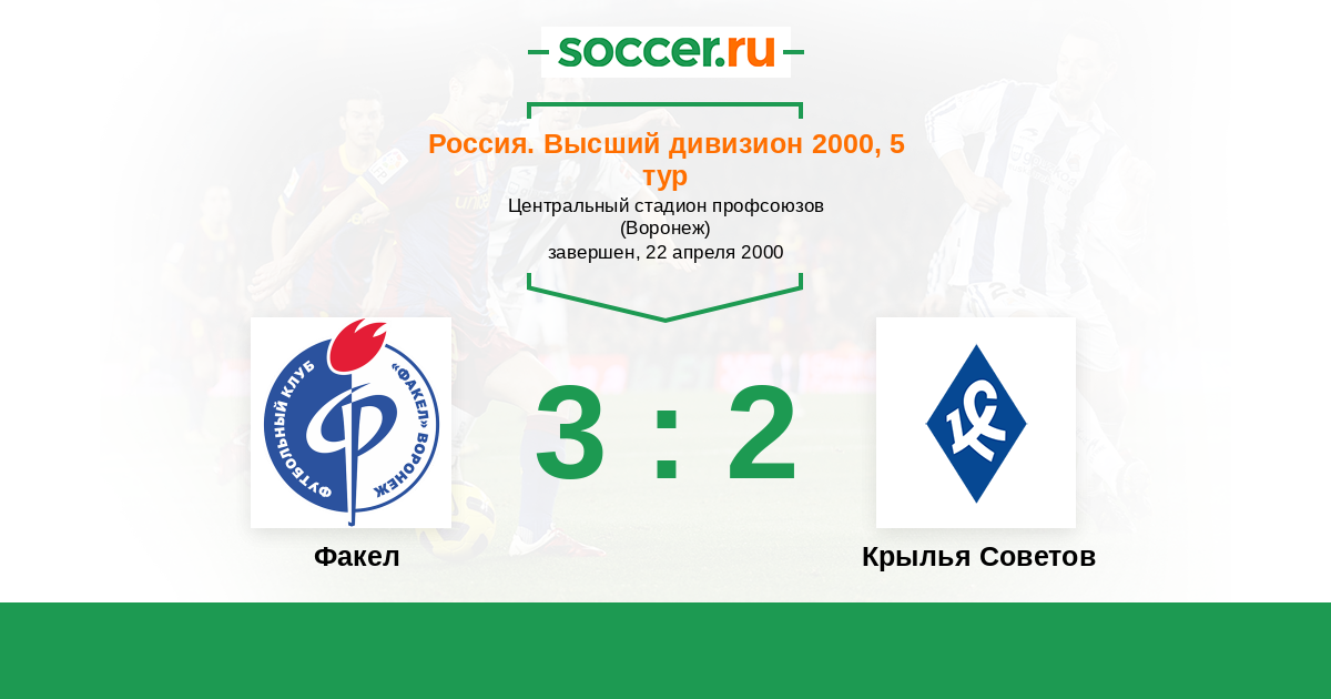 Россия. Премьер-Лига 29.07.2000 Крылья Советов Логотип футбольный клуб Крылья Советов (Самара) 1:1 Логотип футбольный клуб Факел (Воронеж) Факел