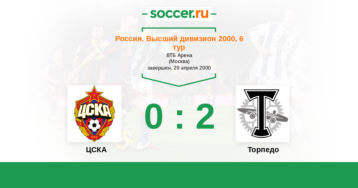 Россия. Премьер-Лига 05.08.2000 Торпедо Логотип футбольный клуб Торпедо (Москва) 0:1 Логотип футбольный клуб ЦСКА (Москва) ЦСКА