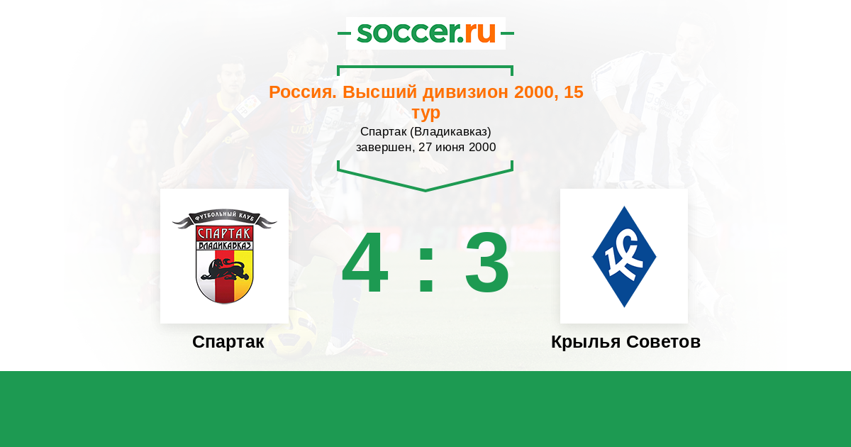 Россия. Премьер-Лига 02.08.1997 Спартак Логотип футбольный клуб Спартак (Владикавказ) 1:1 Логотип футбольный клуб Крылья Советов (Самара) Крылья Советов