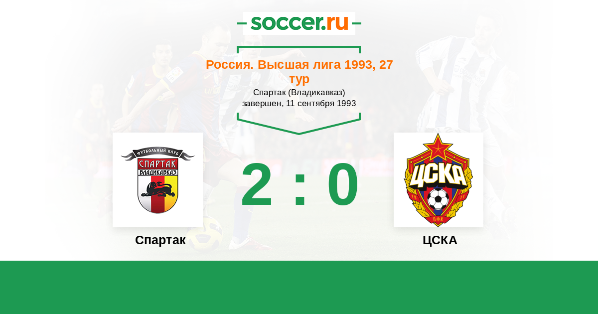 Россия. Премьер-Лига 29.03.1992 Спартак Логотип футбольный клуб Спартак (Владикавказ) 2:0 Логотип футбольный клуб ЦСКА (Москва) ЦСКА