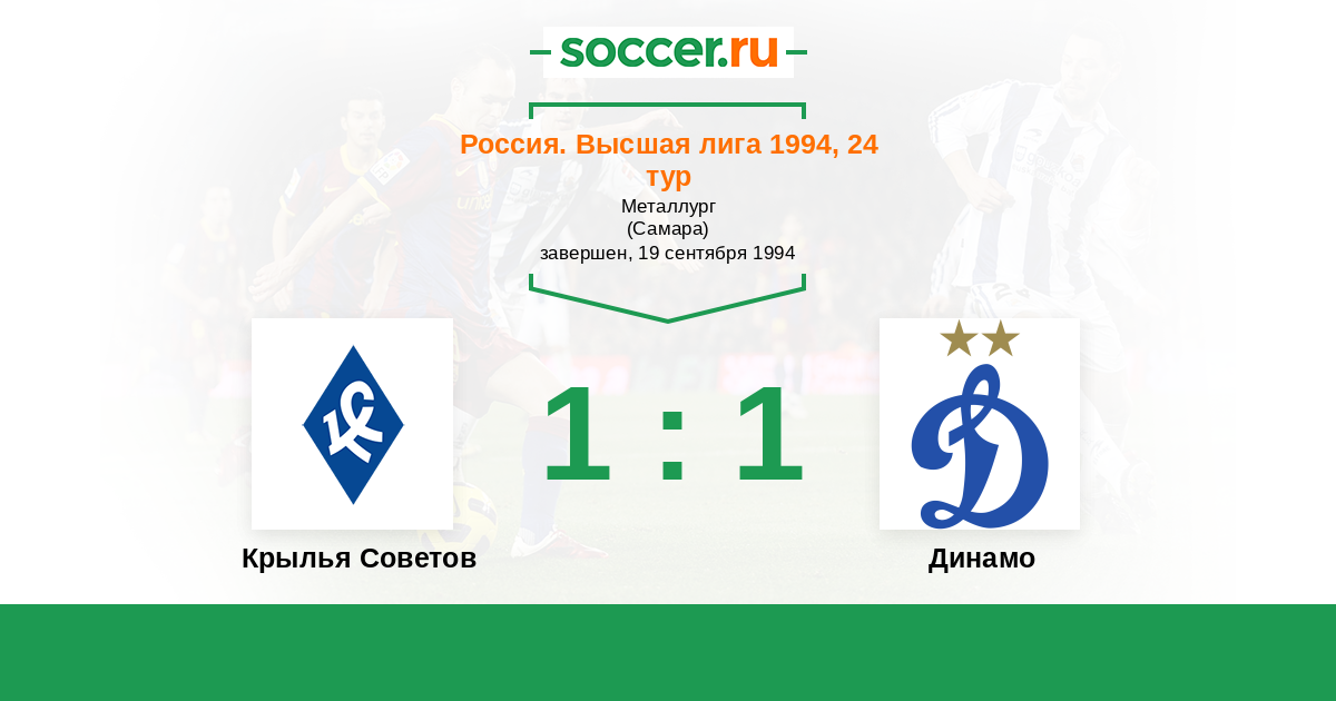 Россия. Премьер-Лига 16.04.1994 Динамо Логотип футбольный клуб Динамо (Москва) 3:0 Логотип футбольный клуб Крылья Советов (Самара) Крылья Советов