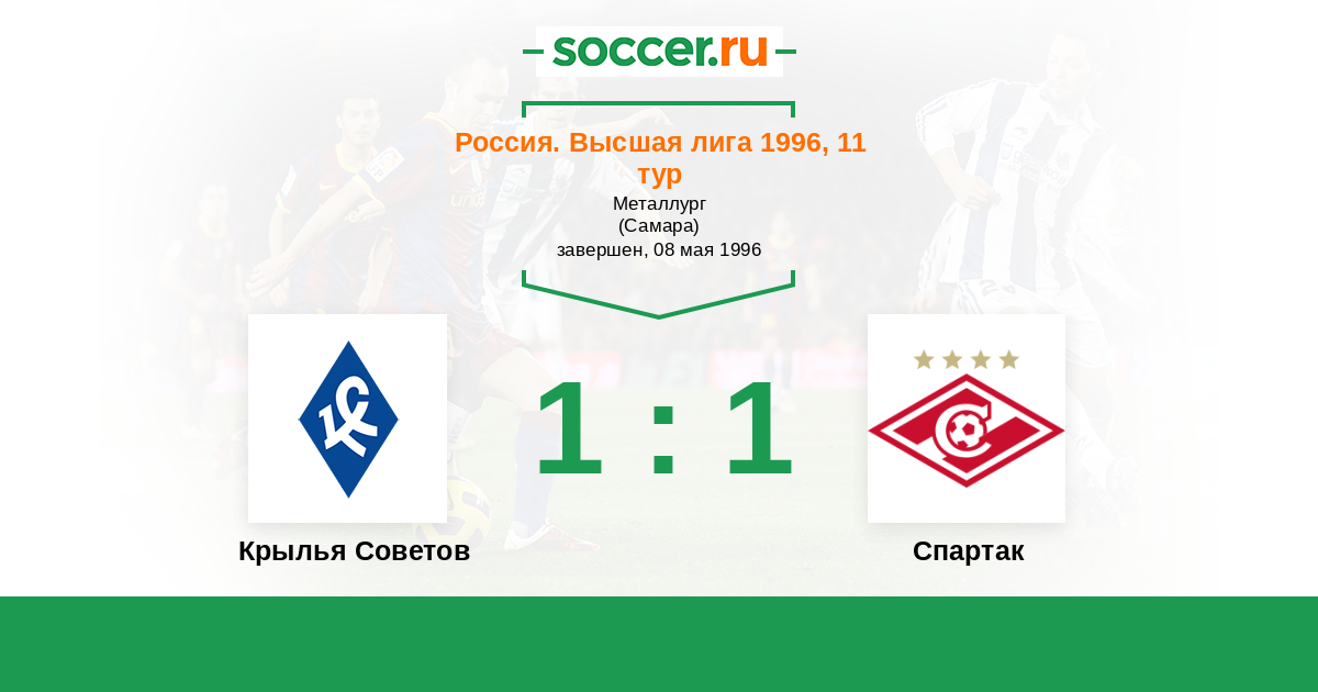 Россия. Премьер-Лига 20.09.1996 Спартак Логотип футбольный клуб Спартак (Москва) 2:0 Логотип футбольный клуб Крылья Советов (Самара) Крылья Советов