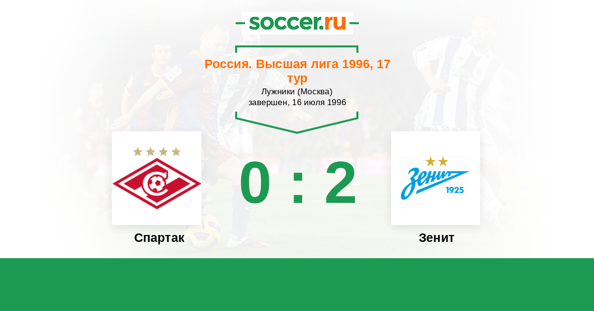 Россия. Премьер-Лига 30.08.1997 Спартак Логотип футбольный клуб Спартак (Москва) 2:0 Логотип футбольный клуб Зенит (Санкт-Петербург) Зенит