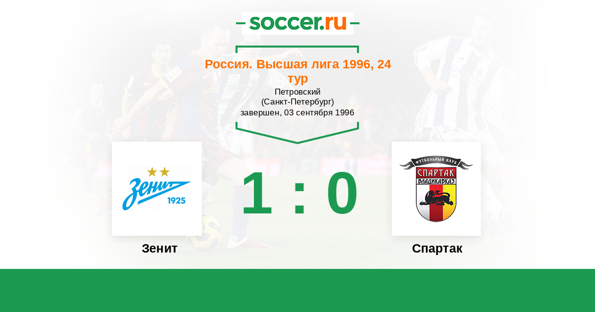 Россия. Премьер-Лига 13.04.1996 Спартак Логотип футбольный клуб Спартак (Владикавказ) 3:1 Логотип футбольный клуб Зенит (Санкт-Петербург) Зенит