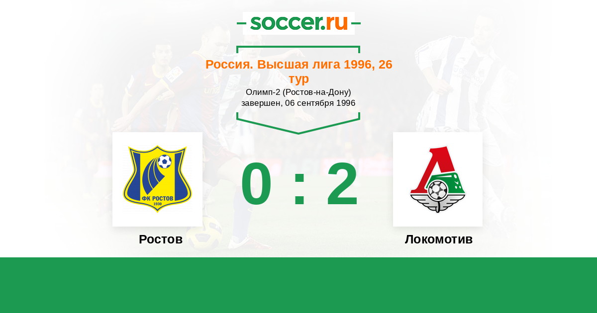 Россия. Премьер-Лига 27.04.1996 Локомотив Логотип футбольный клуб Локомотив (Москва) 2:1 Логотип футбольный клуб Ростсельмаш (Ростов-на-Дону) Ростсельмаш