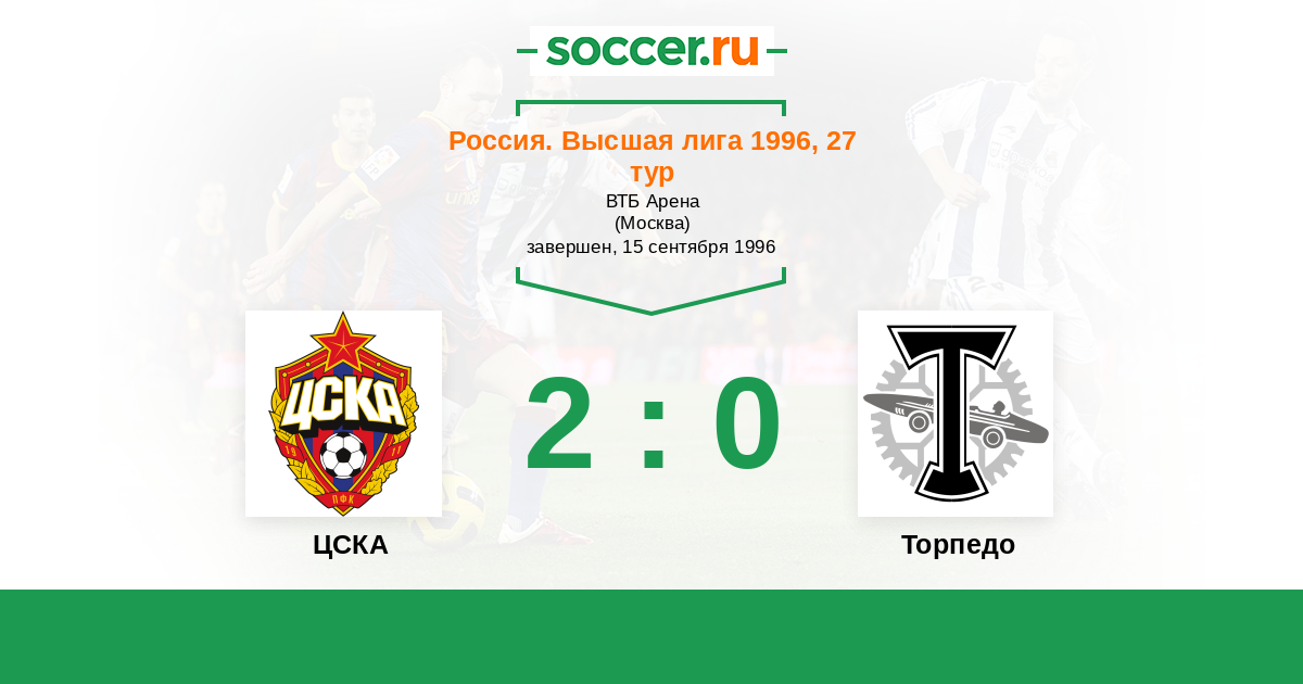 Россия. Премьер-Лига 04.05.1996 Торпедо Логотип футбольный клуб Торпедо (Москва) 2:3 Логотип футбольный клуб ЦСКА (Москва) ЦСКА