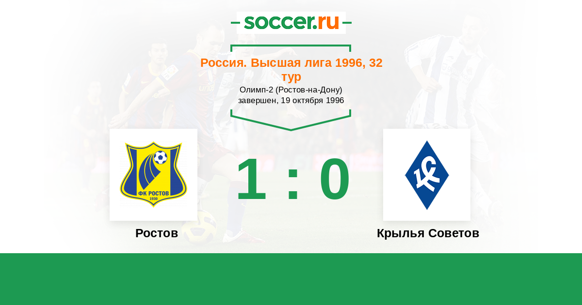 Россия. Премьер-Лига 06.07.1996 Крылья Советов Логотип футбольный клуб Крылья Советов (Самара) 0:2 Логотип футбольный клуб Ростсельмаш (Ростов-на-Дону) Ростсельмаш