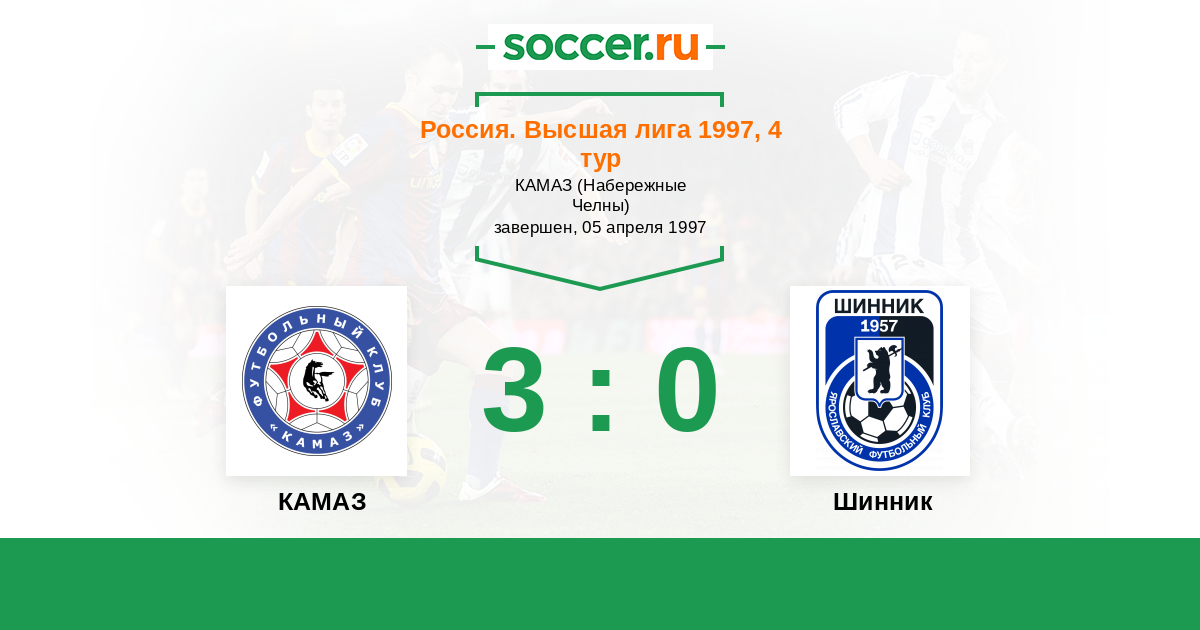 Россия. Премьер-Лига 02.08.1997 Шинник Логотип футбольный клуб Шинник (Ярославль) 1:0 Логотип футбольный клуб КАМАЗ (Набережные Челны) КАМАЗ
