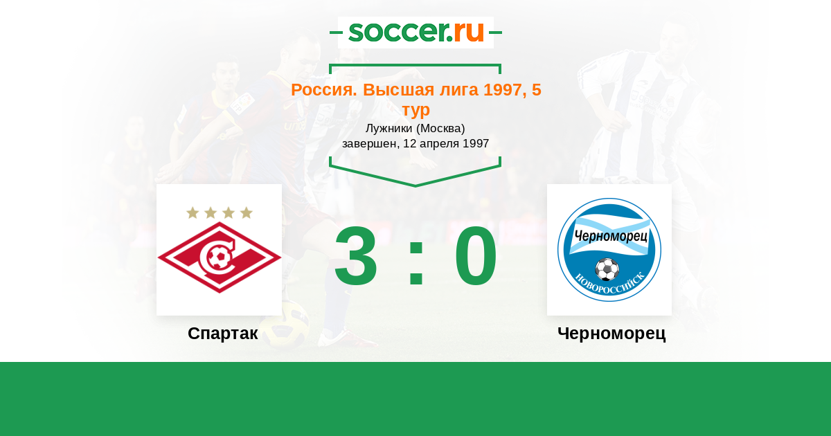 Россия. Премьер-Лига 23.09.1997 Черноморец Логотип футбольный клуб Черноморец (Новороссийск) 1:0 Логотип футбольный клуб Спартак (Москва) Спартак