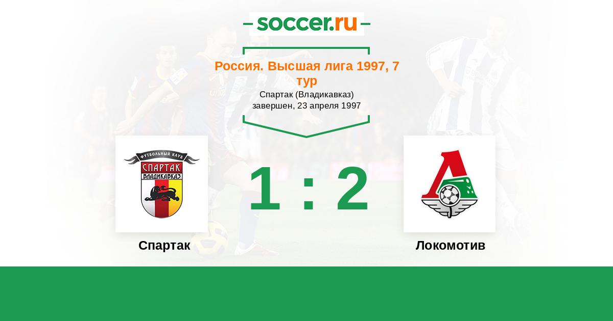 Россия. Премьер-Лига 23.08.1997 Локомотив Логотип футбольный клуб Локомотив (Москва) 1:0 Логотип футбольный клуб Спартак (Владикавказ) Спартак