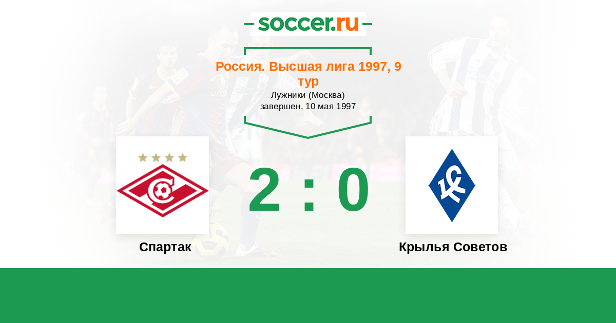Россия. Премьер-Лига 20.09.1996 Спартак Логотип футбольный клуб Спартак (Москва) 2:0 Логотип футбольный клуб Крылья Советов (Самара) Крылья Советов