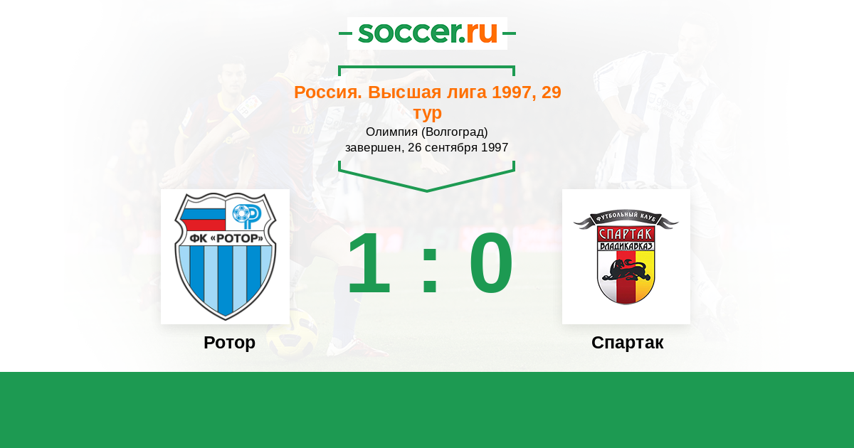 Россия. Премьер-Лига 31.05.1997 Спартак Логотип футбольный клуб Спартак (Владикавказ) 3:2 Логотип футбольный клуб Ротор (Волгоград) Ротор