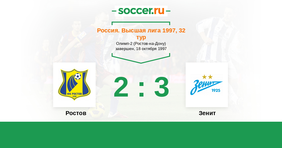 Россия. Премьер-Лига 25.06.1997 Зенит Логотип футбольный клуб Зенит (Санкт-Петербург) 0:0 Логотип футбольный клуб Ростсельмаш (Ростов-на-Дону) Ростсельмаш