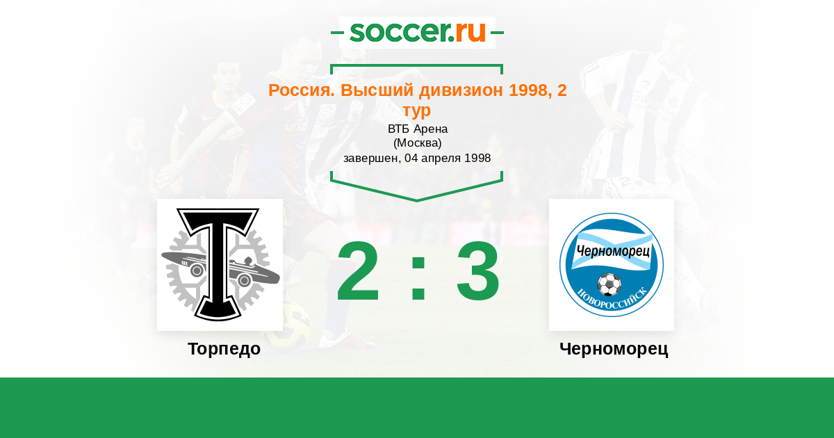 Россия. Премьер-Лига 22.07.1998 Черноморец Логотип футбольный клуб Черноморец (Новороссийск) 1:1 Логотип футбольный клуб Торпедо (Москва) Торпедо