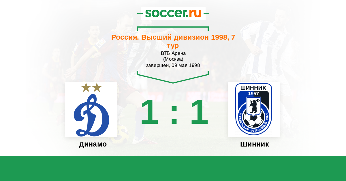 Россия. Премьер-Лига 04.10.1997 Динамо Логотип футбольный клуб Динамо (Москва) 3:0 Логотип футбольный клуб Шинник (Ярославль) Шинник