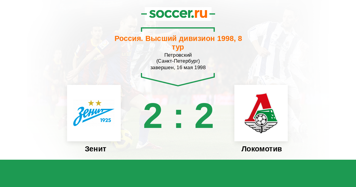 Россия. Премьер-Лига 30.08.1998 Локомотив Логотип футбольный клуб Локомотив (Москва) 3:1 Логотип футбольный клуб Зенит (Санкт-Петербург) Зенит