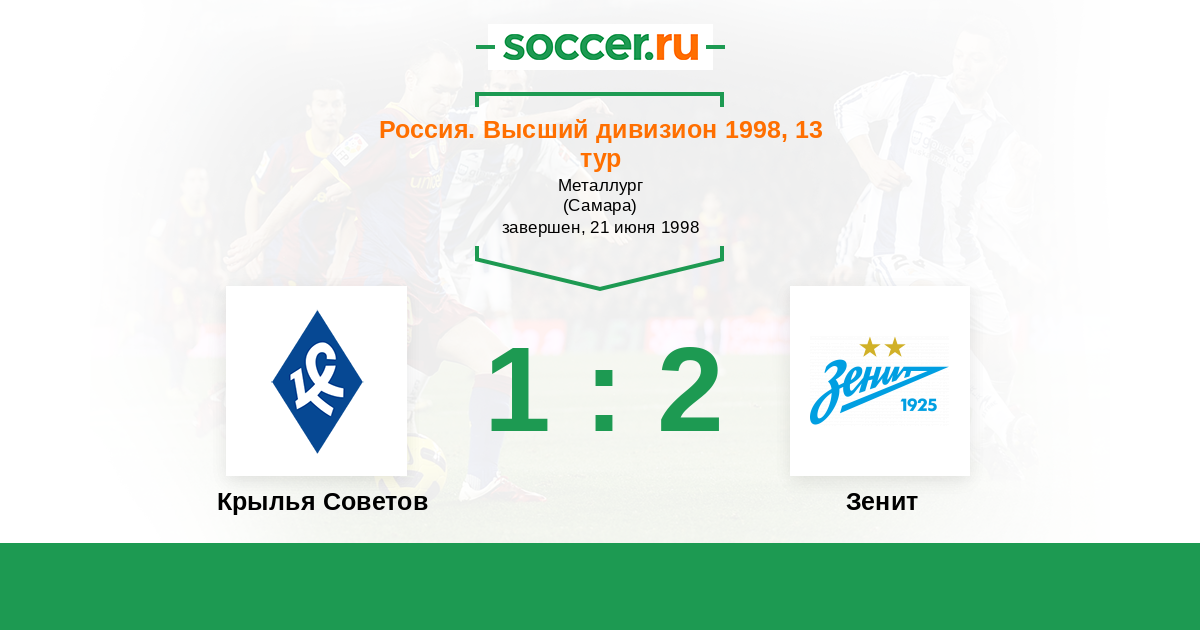 Россия. Премьер-Лига 17.10.1998 Зенит Логотип футбольный клуб Зенит (Санкт-Петербург) 2:0 Логотип футбольный клуб Крылья Советов (Самара) Крылья Советов