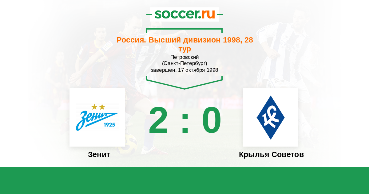 Россия. Премьер-Лига 21.06.1998 Крылья Советов Логотип футбольный клуб Крылья Советов (Самара) 1:2 Логотип футбольный клуб Зенит (Санкт-Петербург) Зенит