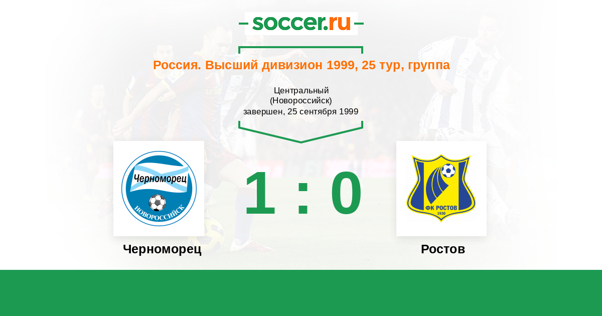 Россия. Премьер-Лига 19.06.1999 Ростсельмаш Логотип футбольный клуб Ростсельмаш (Ростов-на-Дону) 1:0 Логотип футбольный клуб Черноморец (Новороссийск) Черноморец