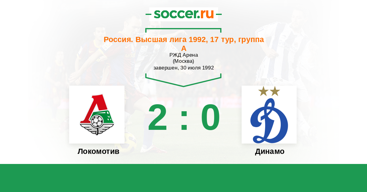 Россия. Премьер-Лига 14.05.1992 Динамо Логотип футбольный клуб Динамо (Москва) 0:0 Логотип футбольный клуб Локомотив (Москва) Локомотив