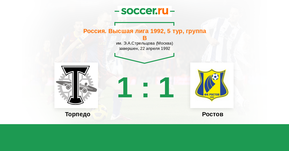 Россия. Премьер-Лига 09.07.1992 Ростсельмаш Логотип футбольный клуб Ростсельмаш (Ростов-на-Дону) 2:1 Логотип футбольный клуб Торпедо (Москва) Торпедо