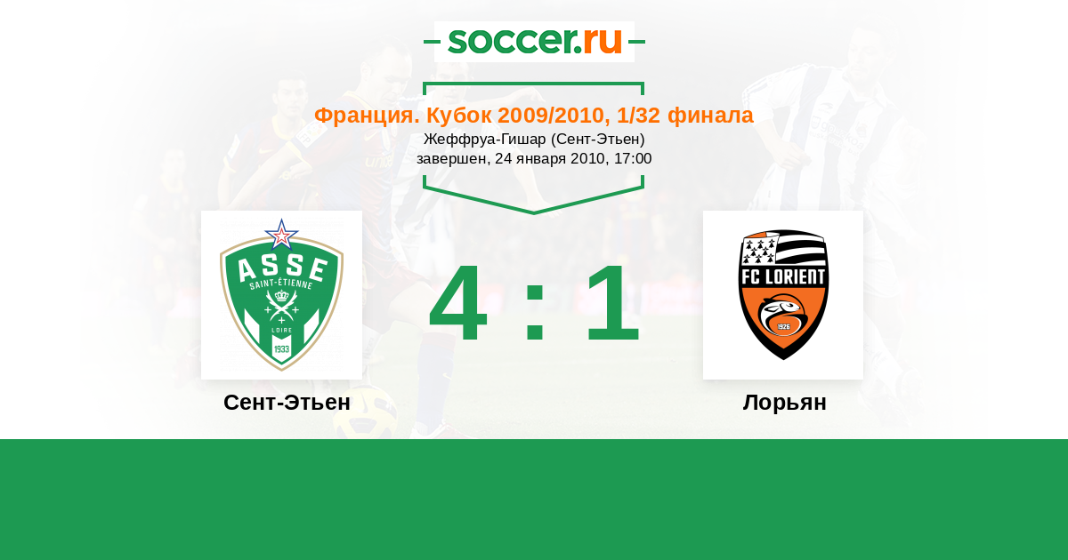 Франция. Лига 1 28.03.2010 Лорьян Логотип футбольный клуб Лорьян 4:0 Логотип футбольный клуб Сент-Этьен Сент-Этьен